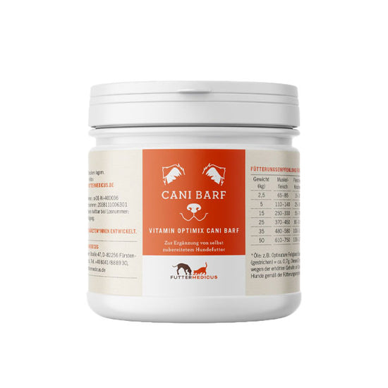 Die Premium Mineralstoff- und Vitamin-Ergänzung Vitamin Optimix BARF ist hochwertig, hochkonzentriert und als feines Pulver gut unter die Futterration mischbar. Durch die hohe Konzentration an Mineralstoffen und Vitaminen ist der Futterzusatz sehr sparsam im Verbrauch. Vitamin Optimix BARF ist von sehr guter Geschmacks- und Geruchsakzeptanz beim Hund.