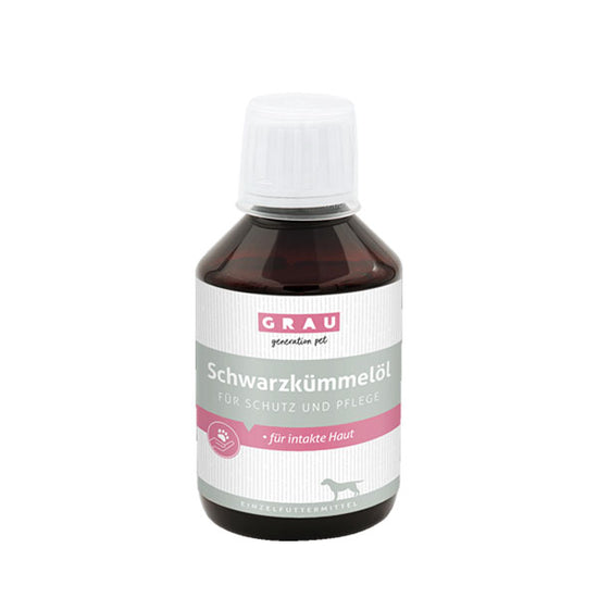 Das 100% reine, kaltgepresstes Schwarzkümmelöl kann dem Futter beigegeben werden und wirkt auf natürliche Weise auf Haut und Fell Ihres Hundes.