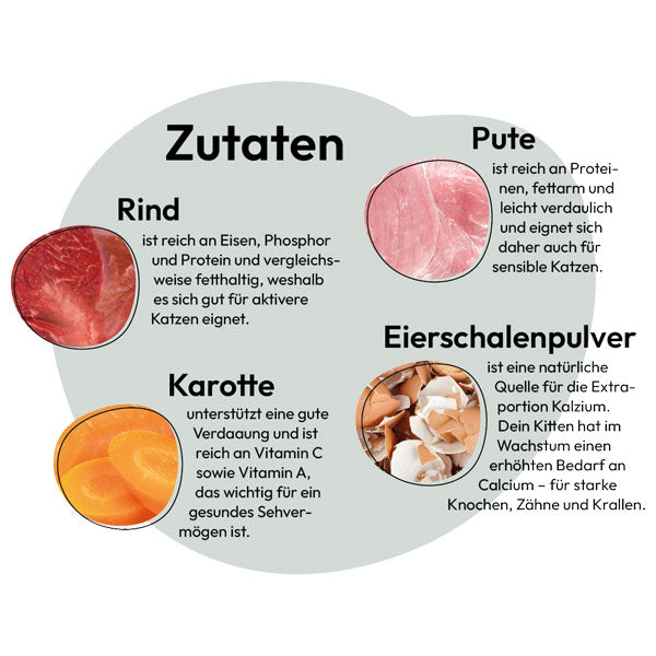 Die ausgewogene Kombination aus Rind- und Putenfleisch mit Gemüse macht dieses Trio besonders protein- und vitaminreich. Das enthaltene Eierschalenpulver ist eine natürliche Quelle für Kalzium, das den erhöhten Bedarf deines Kitten für starke Knochen, Zähne und Krallen abdeckt. Karotte enthält viele Ballaststoffe, die eine gute Verdaaung fördern und überdies zu einer guten Sehkraft beitragen. So ist das Futter der perfekte Begleiter bis zum Ende der Wachstumsphase.