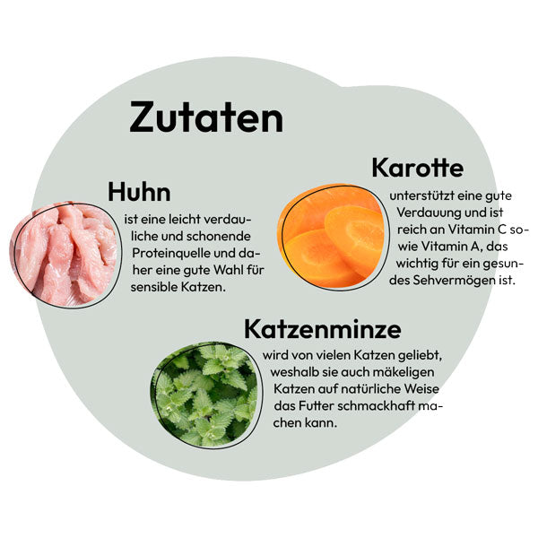 Huhn als einzige tierische Proteinquelle ist leicht verdaulich und daher eine gute Wahl für sensible Fellnasen. Karotte enthält viele Ballaststoffe, die eine gute Verdauung fördern und überdies eine gute Sehkraft unterstützen. Abgerundet wird die Mahlzeit durch Katzenminze: Viele Katzen lieben den Geschmack von Katzenminze, weshalb sie auch mäkelige Katzen überzeugt.