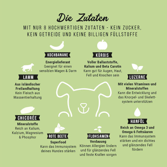- Hoher Fleischanteil: Monoprotein - Lamm als einzige tierische Proteinquelle