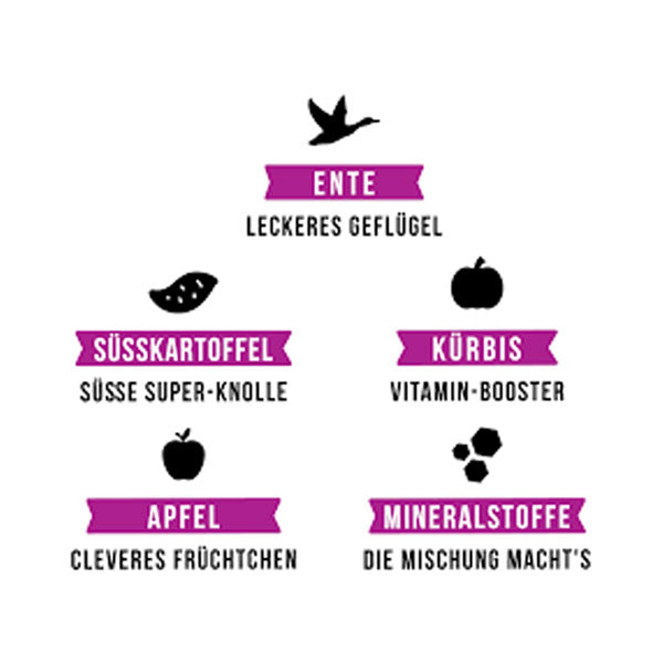 Neben 70% saftiger Ente ist hier das beste Obst und Gemüse drin, ganz ohne Zucker und Getreide. Damit ist am Ente eben einfach alles gut.