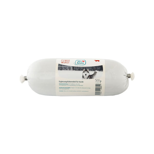 Swiss Natural Power Wurst ist ein getreidefreies Nassfutter mit Schweizer Rindfleisch. Ideal als Fleischersatz für unterwegs.