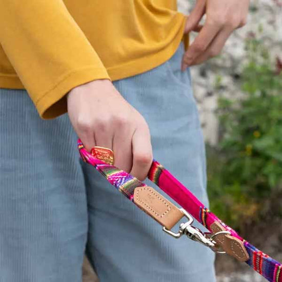 Diese luxuriösen Hundeleinen sind handgefertigt aus weichen Decken im Inka-Stil, die in Bolivien gewebt wurden. Die Ledereinsätze sind aus dickem pflanzlich gegerbtem Leder besetzt.