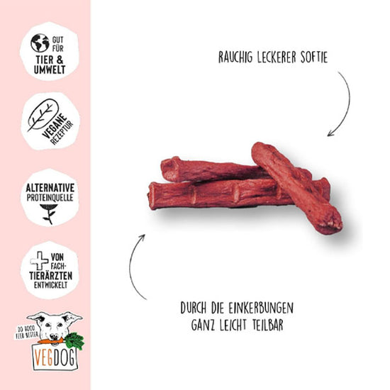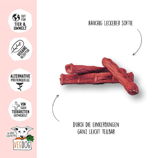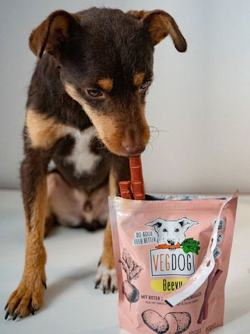 VEGDOG BEEVYS – the jackpot for your gourmet with beetroot and beech smoke. They impress not only with their taste, but also with their unique aroma! Thanks to the easy breakability along the notches, they're also perfect for training. A truly super snack!