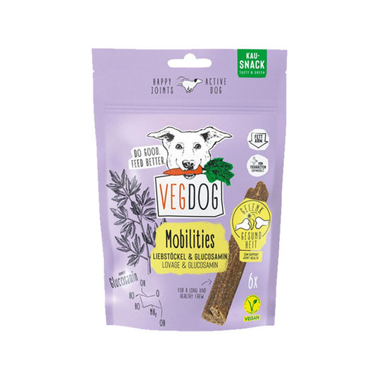 Your dog is a bundle of energy and loves to romp around? What could be better? However, lots of exercise often puts a lot of strain on the joints. Older dogs are also affected by mobility problems. Glucosamine can help maintain and support joint health. That's why MOBILITIES was invented – with an extra-large portion of vegan glucosamine. The result? A delicious, low-fat chew snack that provides your dog with good nutrition and gives their joints a little pampering.