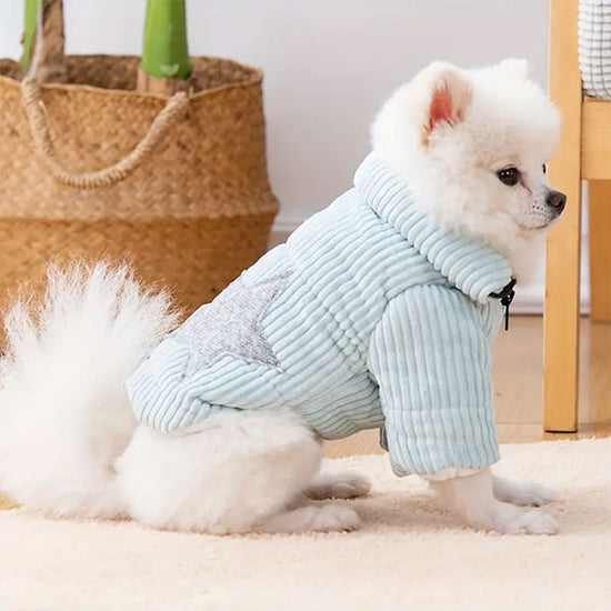 Das warme Aussenmaterial auf Soft-Cord hält Ihre Fellnase bei jedem Wetter trocken und warm. Mit dem kontrastfarbenem Reissverschluss und aufwändigen Sternen-Applikation verziert verbindet diese Jacke angenehmen Tragekomfort und Style für kühle Spaziergänge. Um ein einklemmen der Haare zu vermeiden, ist der Reissverschluss auf der ganzen Länge unterfüttert.